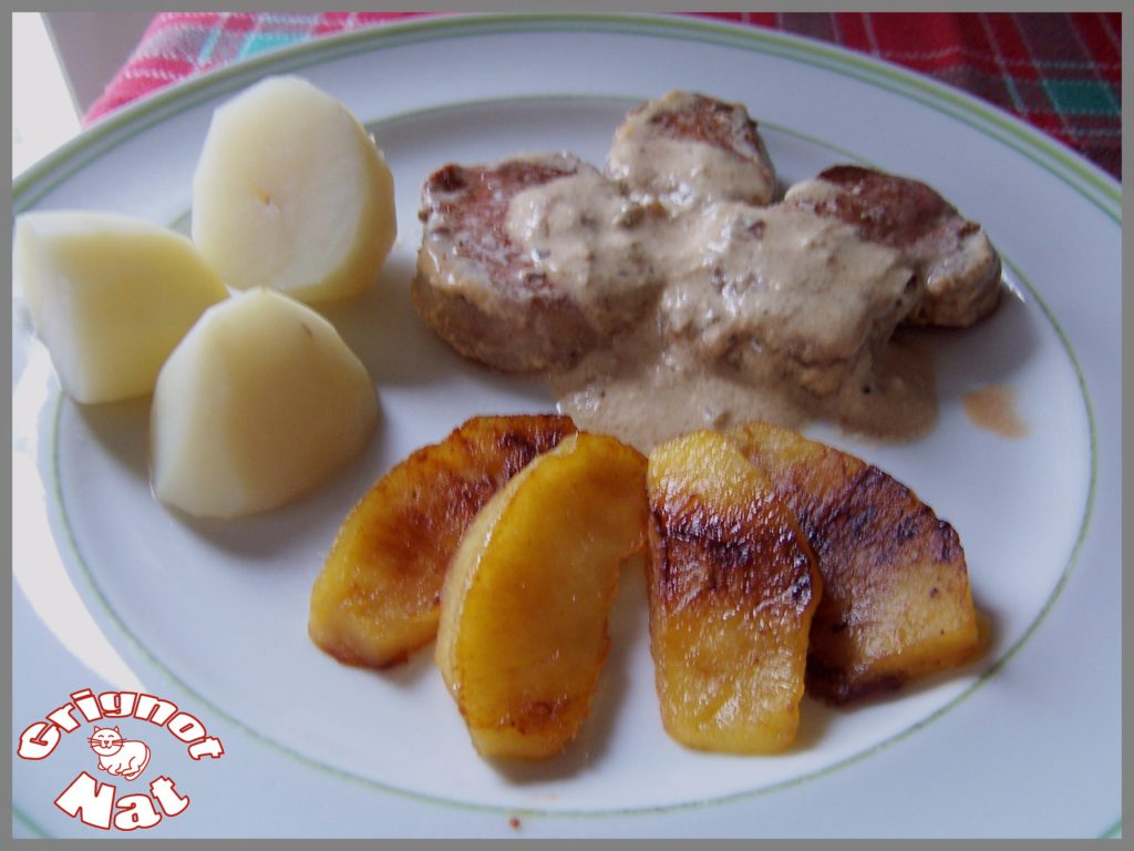 Servir les médaillons à la crème accompagnés des pommes et des pommes de terre.
