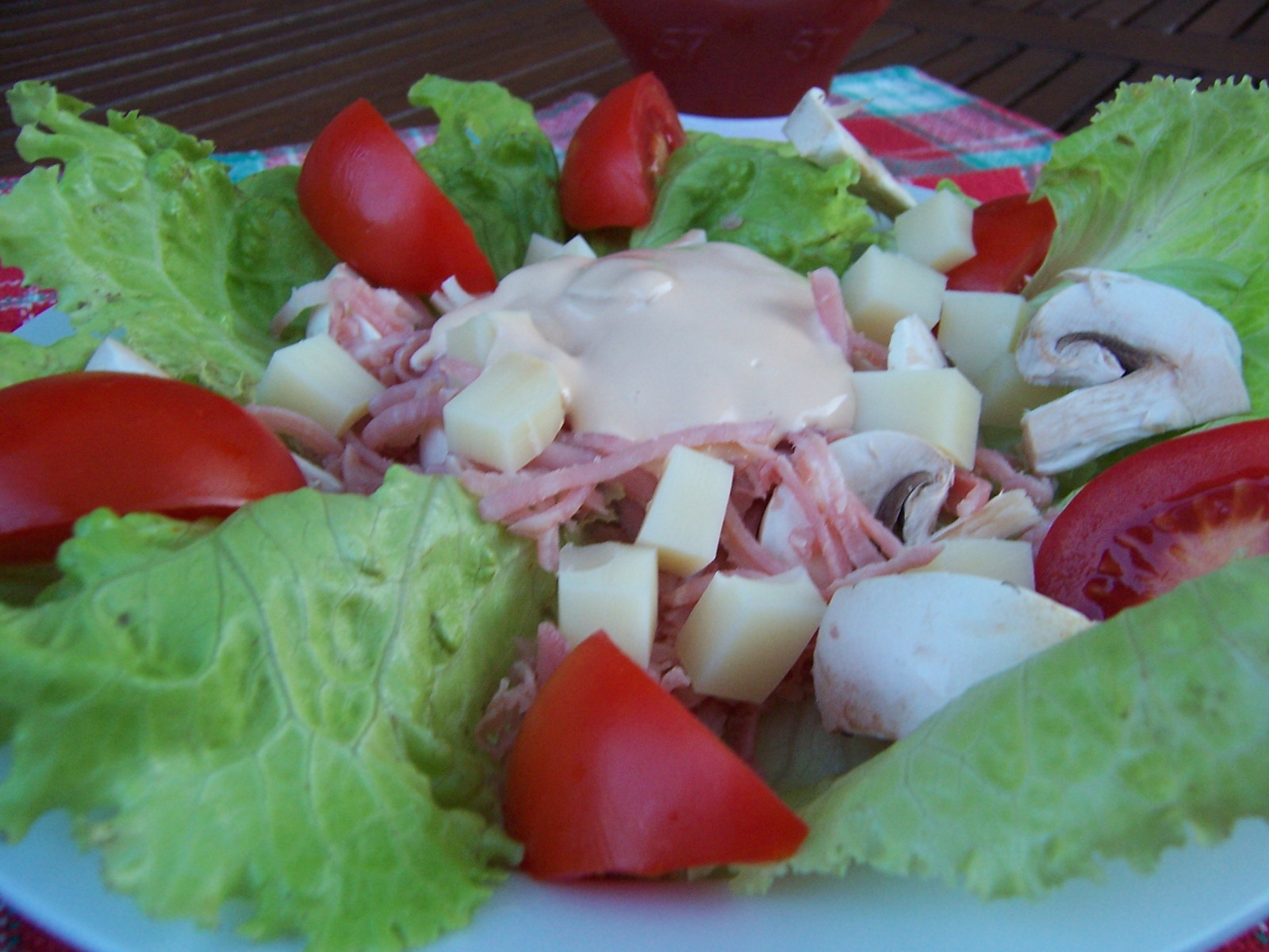 « Bon je ne veux pas jouer les ancêtres en vous proposant ma salade souvenir de jeunesse, mais cette salade j’en mangeais souvent quand j’étais jeune et étudiante. (C’est vous dire si c’est pas d’aujourd’hui !!!). Je l’a dégustais dans un petit restaurant américain où nous allions souvent mon chéri et moi. Le restaurant n’existe plus, mais j’ai toujours le même chéri, alors histoire de se faire une soirée « souvenirs, souvenirs », j’ai essayé de refaire cette fameuse salade, qui se nommait à l’époque la « Chicago Salad » (je ne suis pas sûre qu’elle vienne réellement de Chicago, mais ce n’est pas grave!). »
