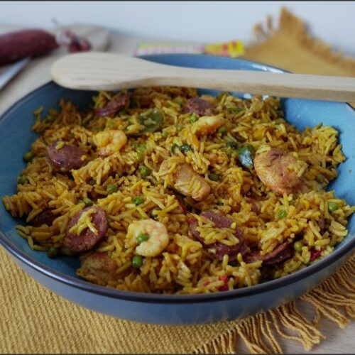 « j’adore la paella mais je n’ai pas vraiment l’énergie ni le temps de me lancer dans la préparation de la vraie paella. Alors j’ai improvisé ce riz façon paella avec les ingrédients que l’on trouve généralement dans ce plat. Il s’agit ici d’une petite recette du quotidien, simple et rapide à préparer qui a toujours du succès à la maison. Et je pense que c’était très bon à en juger par les assiettes rendues quasi propres à la fin du repas ! »
